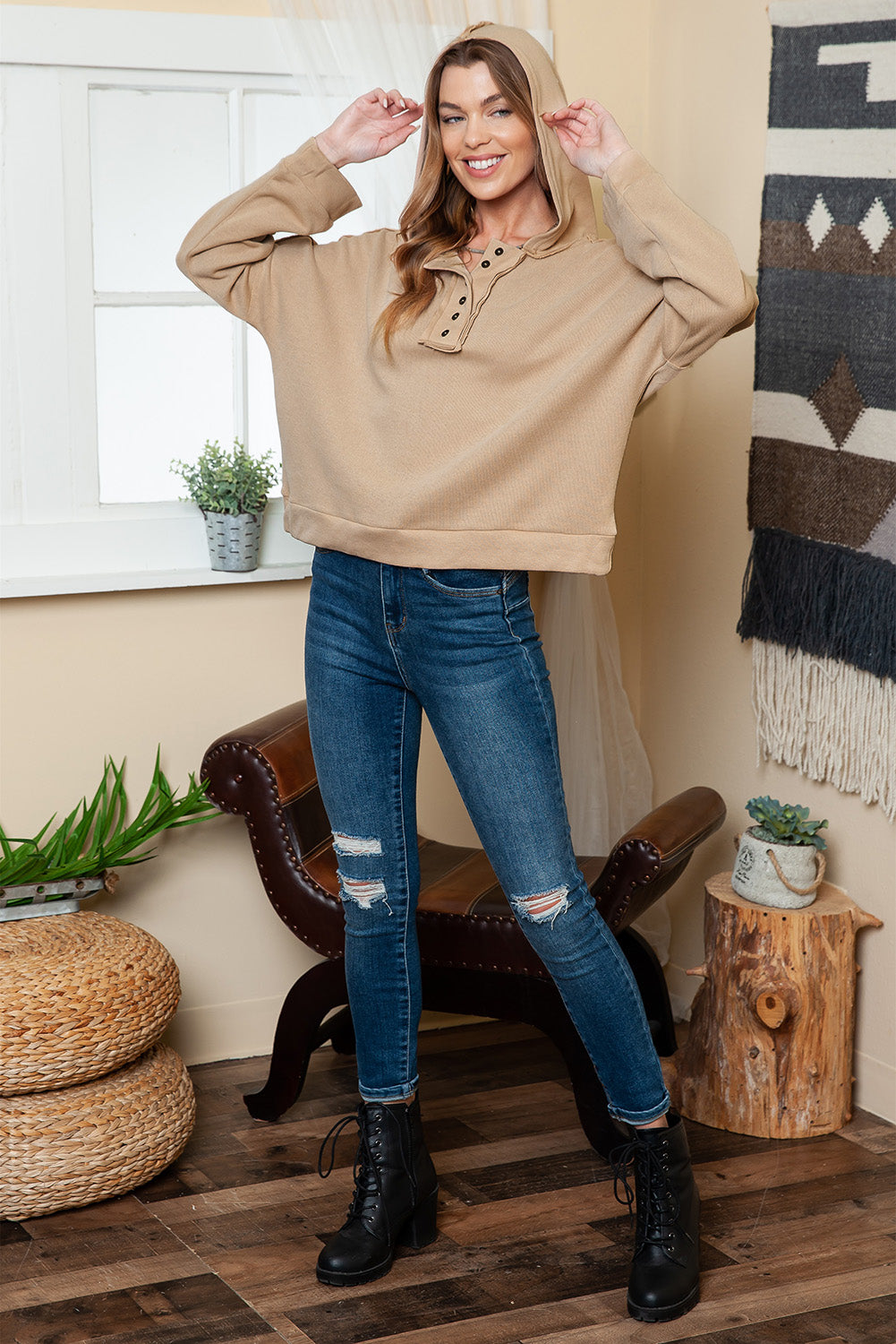 Khaki Solid Color Casual Button Seam Trim Hoodie