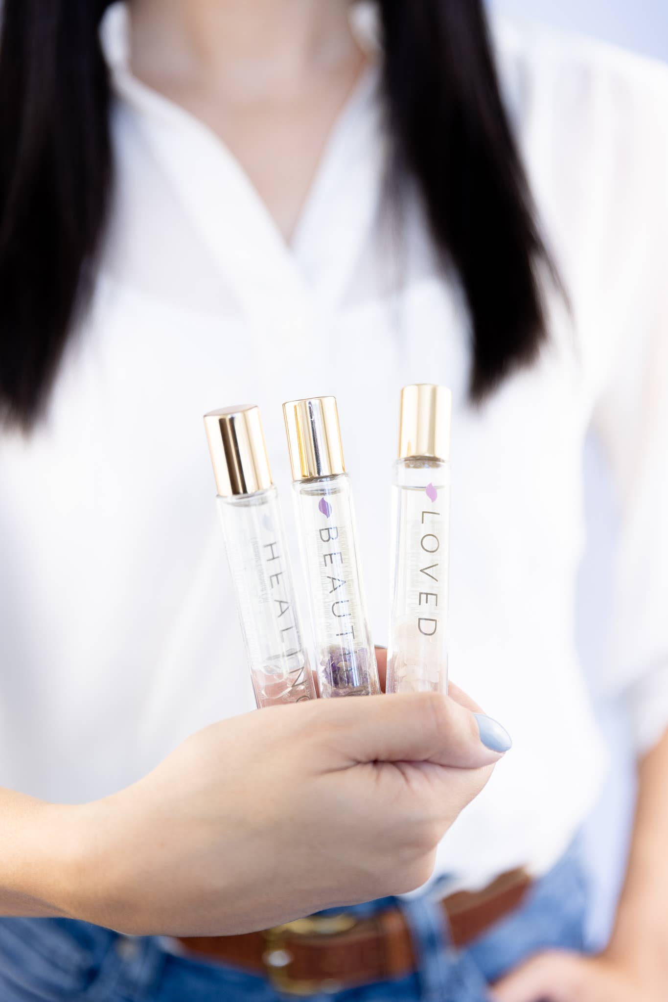 Feel embraced with our LOVED Crystal Roller. Featuring genuine rose quartz crystals and a tender blend of lavender, rose, geranium, and orange essential oils, this comforting aroma supports self-love and daily self-care rituals. Perfect for calming moments and heartfelt gifting. • All-natural and free from synthetics or artificial fragrance • Crafted with 100% organic coconut oil • Soft, floral, comforting scent • Reusable glass bottle with gemstone sparkle • Ideal for wellness boutiques, gift shops & spa retail LOVED is part of our Crystal Roller Blend Collection—also available in Beautiful, Brave, Calm, and Healing. Each blend offers a unique scent and intention to inspire joyful, intentional self-care and promote taking care of yourself. ✨ Makes a meaningful gift for loved ones, anniversaries & encouragement ✨ Great for self-care boxes, spa favors & affirmation gift set ✨ Perfect for brides and thoughtful wedding day gifts ✨ Packaged for gifting with a clean, minimalist aesthetic
