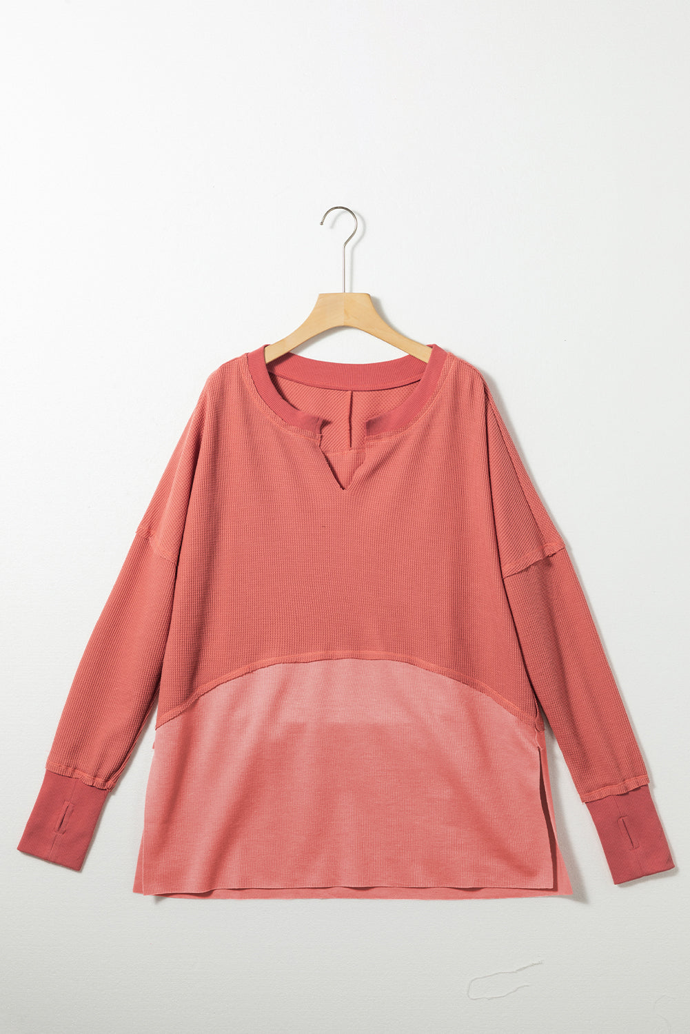 Mineral Red Waffle Knit Patchwork Exposed Seam Long Sleeve Top